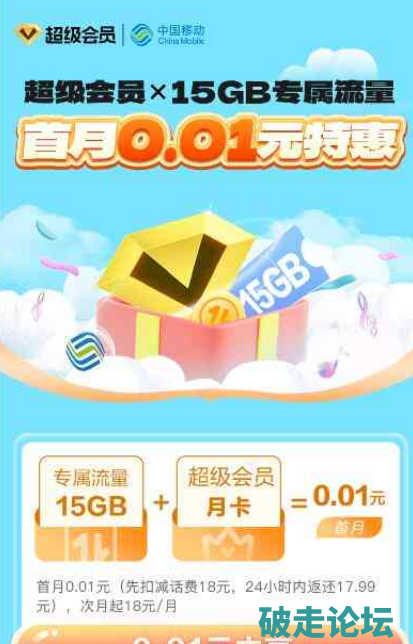 移动0.01元开1个月豪华绿钻+15GB流量