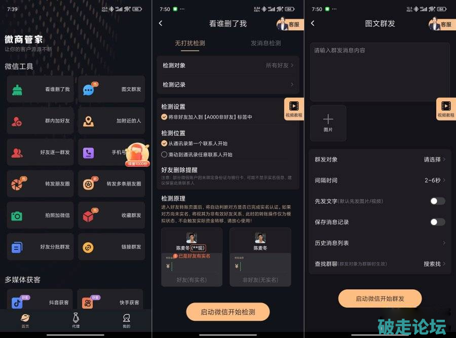 【特色功能】 1. 短视频拓客:通过关键词搜索抖Y/快S/小红书/视频号,智能精准筛选评论,快速定位目标客,同时发送自定义消息,打破传统获客瓶颈,解放双手,轻松拓客。 2. qun发助手:无论是文字、图片、视频、收藏,还是链、公zhong号、小程序、名片,统统支持,一键qun发让推guang更高效。 3. 加人:qun加好友、手机号加v、拍照加v等多种高效方式,拓展您的人脉网络。 4. 好友清理:精准发现已经删除或拉黑你的好友,全程零打扰。 5. 朋友圈转发:告别复制粘贴的繁琐,一键转发朋友圈,让跟圈变得前所未有的便捷。